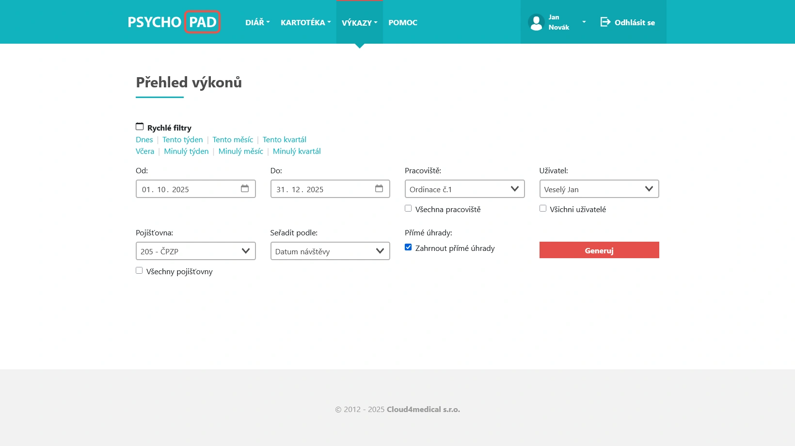 Historie výkonů, možnost kopírování předchozích výkonů, kontrola správnosti pojišťovny a typu pojištění, aj.